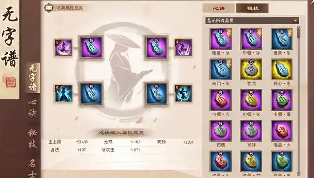 进入游戏后,轻点无字谱界面,映入眼帘的是左侧整齐排列的四大选项卡:无字谱、心诀、秘技、名士。右侧则直观展示了角色当前装备的四式心诀及秘技组合。接下来,我们将逐一揭开心诀、秘技、名士的神秘面纱。